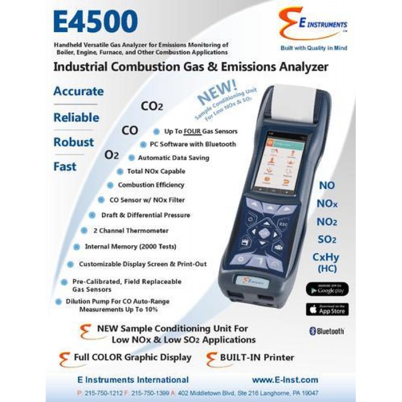 Flue Gas Analyzer Including E-4500O2 Sensor 0 To 25 %Co Sensor 0 To 8000 Ppm**With Auto-Range Up To 10%No Sensor 0 To 5000 PpmNo2 Sensor 0 To 5000 PpmCo2 Calculated 0 To 99.9 %Flue Gas & Air Temperature Measurement Draft & Differential Pressure Measurement Efficiency, Losses, & Excess Air Calculations 300mm Probe, 800oc Max, With 3m Dual Hose External Water Trap With Filter Cartridge Internal Memory, 2000 Tests Built-In Printer With Non-Fading Paper Rubber Holster With Magnetic Support Automatic Periodic Data Saving Software Package W/Bluetooth & USB Cable Abs Hard Plastic Carrying Case Full Color Graphic Display Screen Recommended Spare Consumable Parts: Filter Cartridges (Pack Of Five)Non-Fading Paper Rolls (Pack Of Ten)Optional Accessories:3m Dual Hose Extension SCU (Sample Conditioning Unit)Differential Pressure Hose Kit