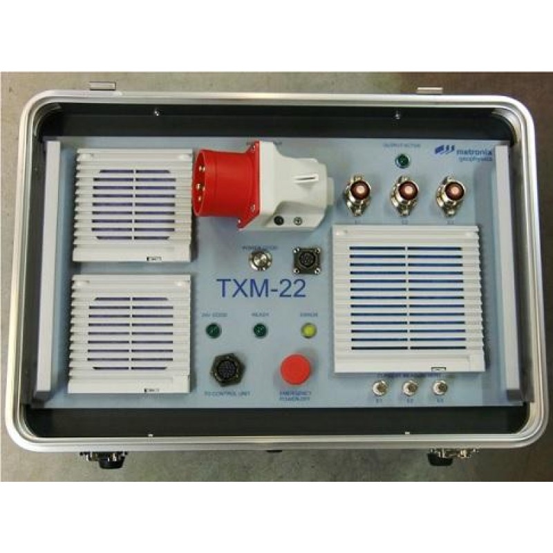 The TXM-22 is a highly efficient multi-purpose geophysical power source. It is designed for use in connection with the TXB-07 controller unit. The TXM-22 and TXB-07 form a powerful and flexible transmitter for geophysical applications such as Controlled Source Audio Magnetotellurics (CSAMT), Controlled Source Electro magnetics (CSEM) or Long Offset Transient Electromagnetics (LOTEM).