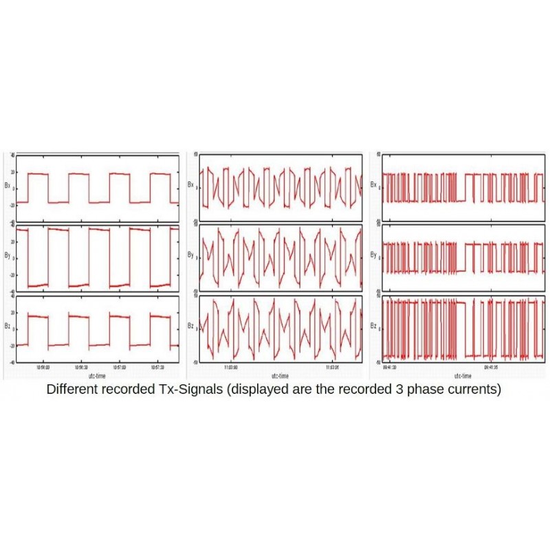 The transmitter outputs are connected to 3 electrodes, thus offering the possibility to rotate the current vector in any direction. The TXB-22 uses a Pulse-Width Modulation (PWM) to control the transmitted currents. By this means it is possible to create different output waveforms such as sine wave, square wave, triangle, sawtooth, Pseudo Random Binary Sequences (PRBS) or other user definable signals. For frequencies higher than 2048 Hz the TXM-22 will transmit a square wave only.