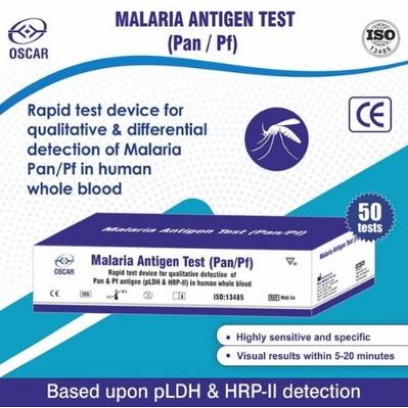 - Oscar Malaria Antigen ‘Pan/Pf’ card test is available in 50T pack and each kit contains individually pouched test cards, disposable droppers, buffer vials and product insert.
