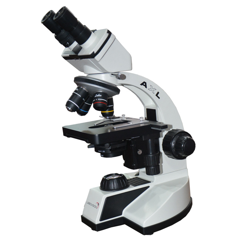 AXL C Shaped Sturdy standBinocular tube, 45° inclined, 360° rotatable, IPD 55-75 mmWide Field eyepiece WF 10x/18mm paired with eye guardsQuadruple Nosepiece (Ball bearing type)BJ series DIN Semi Plan Achromatic objectives4x, 10x, 40x (SL) and 100x (Spring loaded, oil immersion)Stage rectangular size 142 x 133mm with double platemechanical stage cross travel 75 x 50mmon ball bearing with co-axial controlSub-stage ABBE condenser NA 1.25 with aspheric lens.Iris diaphragm and special day light blue filterCo-axial coarse and fine focusing mechanism with tensioncontrolDetachable illumination system 6V-20W Halogen with intensitycontrol. Power Input 220V ACPacked in moulded styrofoam box, with operation manual,dust cover and cleaning cloth
