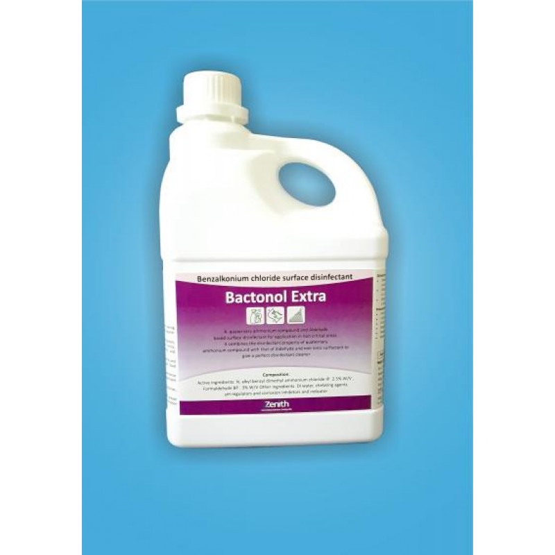 Bactonol Extra is a quaternary ammonium compound and Aldehyde based surface disinfectant for application in non critical areas. It combines the disinfectant property of quaternary ammonium compound with that of Aldehyde and non ionic surfactant to give a perfect disinfectant cleaner.