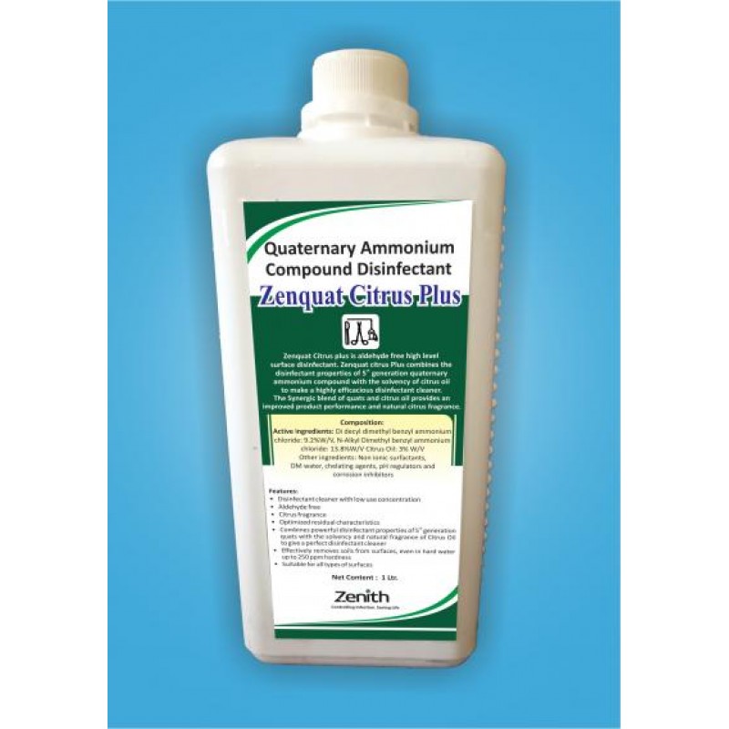 Zenquat Citrus plus is aldehyde free high level surface disinfectant. Zenquat citrus combines the disinfectant properties of 5th generation quaternary compound with the solvency of citrus oil to make a highly efficacious disinfectant cleaner. The Synergic blend of quats and citrus oil provides an improved product performance and natural citrus fragrance.