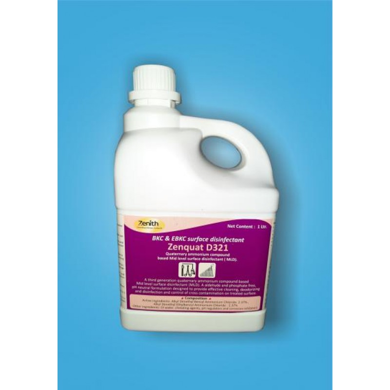 Zenquat D321 is a third generation quaternary ammonium compound based Mid level surface disinfectant. It is a aldehyde and phosphate free, pH neutral formulation designed to provide effective cleaning, deodorizing and disinfection in areas where housekeeping is of prime importance in controlling the hazard of cross contamination on treated surfaces and controlling foul odours.