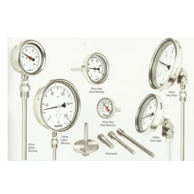 Construction features dial size : 63mm, 100mm & 150mm accuracy : 1. 6% of full scale case & bezel (IP-65) : ss 304 snap action bayonet type & ss 304 press fil type pressure element : wounded coil of bi-metal stem & bulb : ss 316, ss 304 stem & bulb DIA : 6mm, 8mm, 10mm & 12mm stem length (STD ) : up to 300mm dial : aluminum white painted with 270 degree black scale marking pointer : al / brass with black finish window : plain glass / toughened / safety glass joints : argon arc welded mounting : stem (bottom), black & every angle connection : ⅟4 / ⅜ / ⅟2 BSP / NPT (fix or adjustable) scale range : 30 to 50o to 600o C or equivalent in o