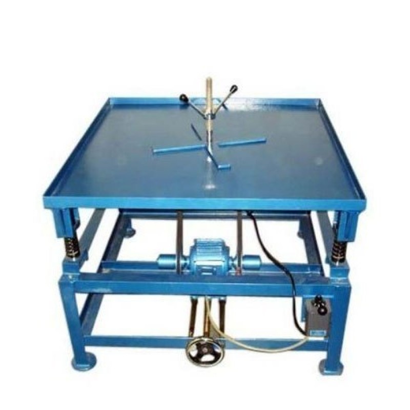 It is designed to carry a load of 140 kg . The apparatus consists of a motor fitted with a variable pitch pulley housed in a cabinet. The vibrations are imparted by means off-balance masses rotating on a shaft of a vibrator clamped to the underside of the table top. The table top is 500 x 500 mm and has stops along its edges to prevent moulds from walking off the table during vibration . A crass arm adjustable on a vertical rod at the centre of the table is provided to hold the moulds while operating the between a maximum of 3600 vibrations down to