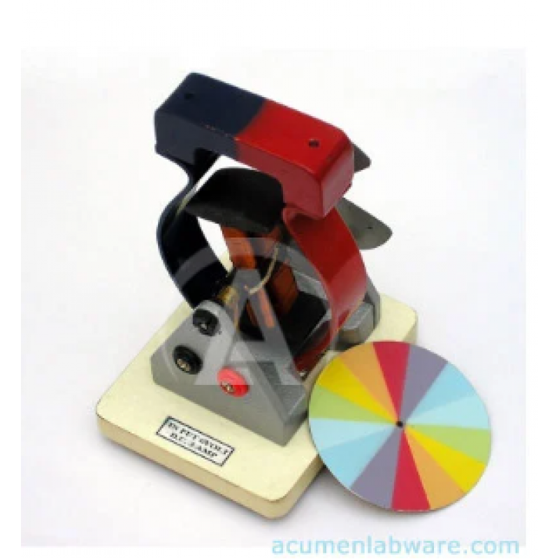 A model of the simplest form of DC motor; having 3 armatures - 2 pole, 3 pole, & 4 pole, wound with enameled copper wire, & a permanent magnetic field provided by a removable bar magnet. The construction is completely open & all components are readily observable. A disc type commutator is incorporated & external connection to the phosphor - bronze bushes is by means of a pair of 4mm sockets. The motor shall operate on 4.5 to 9 volts DC.