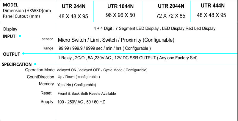 - OUTPUT : 1 Relay , 2C/O , 5A ,230V AC , 12V DC SSR OUTPUT ( Any one Factory Set)