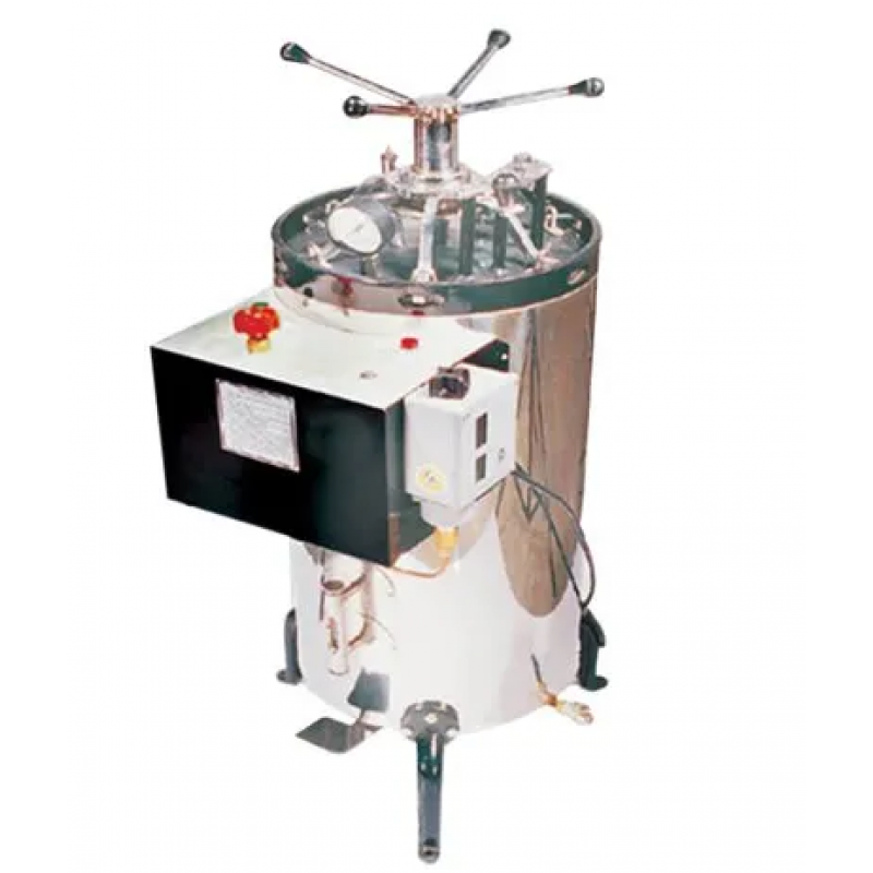 High Pressure Vertical Autoclave based on the principal of saturated steam sterilization. Electrically heated. Used for sterilization of rubber, utensils, linen, plastic, dressing material, surgical items, glasswares, labware etc. It is used in scientific research institutions, universities, hospitals, mushroom centres, tissue culture labs etc. Sturdy construction, double walled, inner chamber i.E. Boiler made of 16 swg stainless steel of 304 quality, outer shell is made of thick mild steel duly painted. The boiler and outer shell are provided with air insulation. Lid is made of thick ss duly stainless steel lined and is tightened by radial locking system. Lid is mounted on a central screw and is provided with best quality joint less neoprene gasket to avoid any risk and trouble free operation.
