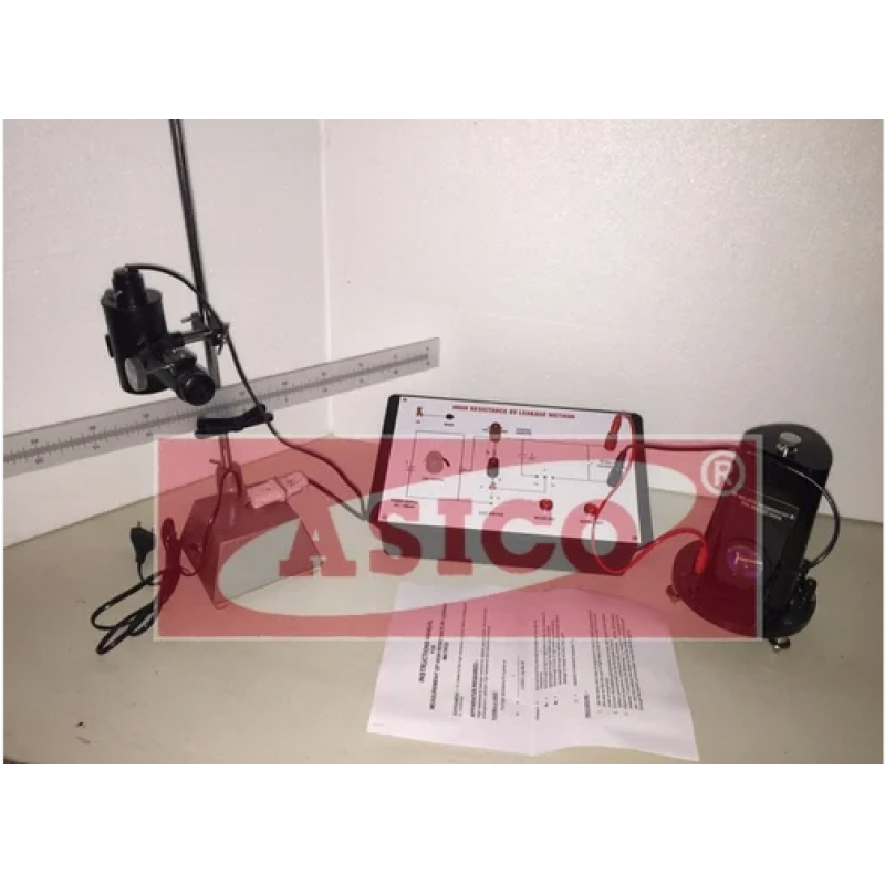 High Resistance Measurement by Leakage Method is useful for measuring very high value of Resistance. Digital Multimeters or LCR meters are used to measure the normal value of resistance (generally 1Ω - 20MΩ) but in the case of very high value of resistance these are unable to measure with high accuracy. Leakage method is very accurate way to measure the high value of resistance because of very sensitive ballistic galvanometer with scale & lamp arrangement and very low value of capacitances used in the product. It is provided with different values of unknown high resistances on rotary selection and different values of capacitors.