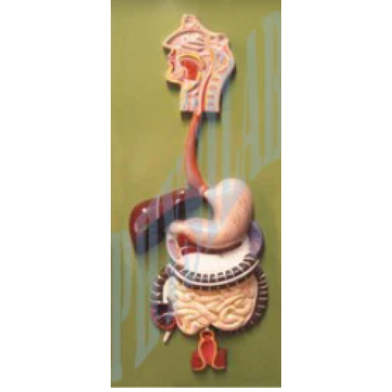 Representation of nose, mouth cavity and pharynx, esophagus the gastrointestinal tract, liver with gall bladder pancreas and spleen, duodenum, cecum and rectum are opened in this human digestive model. The transverse colon of human digestive model is removable. Mounted on board. Numbered with english key card.