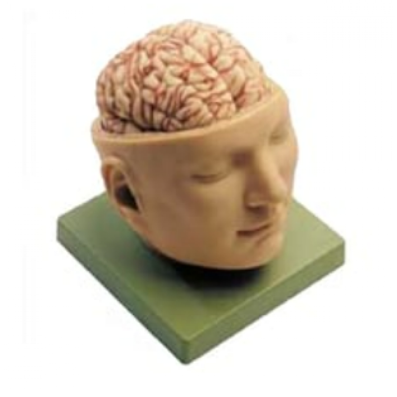 Life size model of human head mounted on base, the brain dissectable in two parts,