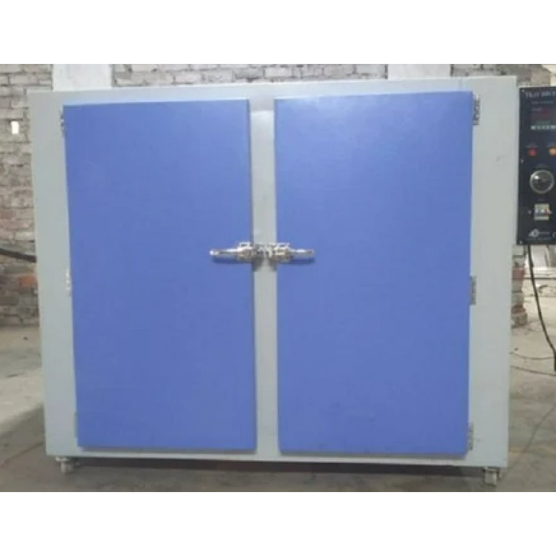 Double walled, mounted on sturdy angle iron frame. Inner made of thick G.I. / PCRC Sheet duly painted with high temperature aluminum paint, outer made of heavy duty PCRC duly primer coated and enamel painted. Insulation between inner and outer wall is done with 75mm thick glass wool to prevent any heat loss. Provided with double walled door with a system to prevent its opening. Door is provided with best quality handle, gasket etc. Provided with brackets to support the heavily laden trays at different heights. Temp. Range is from ambient to 250 C with an accuracy of + 3 C or as desired by you and is controlled byMicroprocessor PID controller with PT-100 sensor. Heating is done with ISI mark heating elements made from Ni-chrome heating wire placed in the sides of the chamber. Motor blower system in the side of the chamber to maintain the uniformity of the temp. Throughout the chamber. Works on 220V/440V and 50HZ single phase/three phase A.C. provided with exhaust shaft on the top of the body.