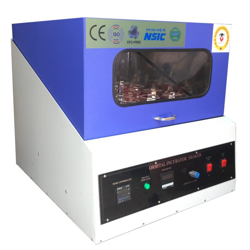 Orbital Incubators Shaker are design for continues shaking for solution in Erynmeyer flask from 100 ml to 1000 ml at a constant set temperature range 5°C to 60°C. the outer body made mild steel, Inner chamber and shaking tray are made of SS 304G with fine finish. Plate- form is fitted with lotus clamps of nylon clamps. The motion of plate – form is by means of heavy duty DC motor with continues variable speed regulator , range 50 to 250 rpm.