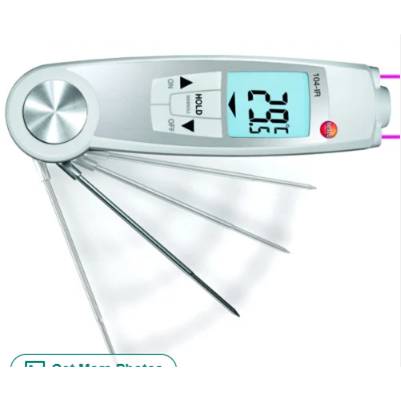 The Infrared and Penetration Thermometer is a waterproof (IP65) penetration thermometer combined with an infrared sensor for non-contact temperature measurement. It can be used for all sorts of applications in the food sector. The Testo 104-IR scans the surface temperature of individual foods or entire goods pallets without contact, particularly in the Incoming Goods department. If a limit value is exceeded or undershot, the hinged penetration probe is also able to measure the core temperature.