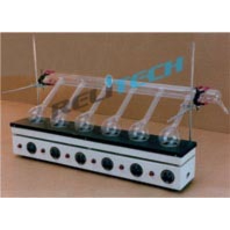 Complete with heating box and fume duct. The 500 watts heaters are 6 inches apart having individual ON/OFF switches and energy regulators. The height of the side clamps provided are adjustable to accommodate Kjeldahl flasks of 300ml, 500ml or 800ml. Without flasks but supplied with fume duct. (Kindly mention the type of fume duct and place order for Kjeldahl flasks extra as per requirement.)