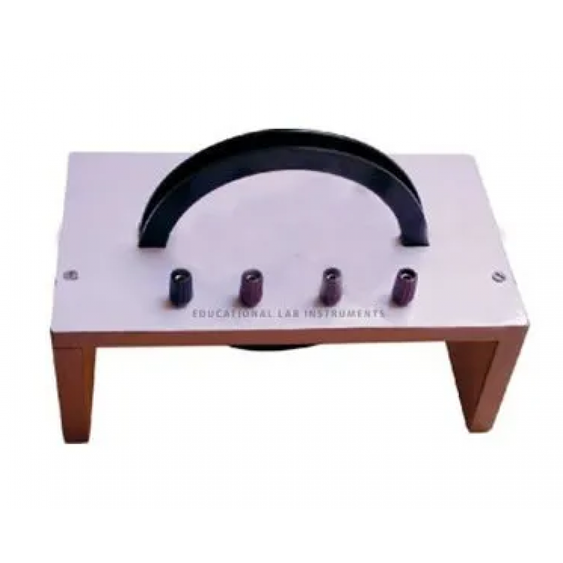To demonstrate the production of magnetic field by current flowing in a solenoid. A small wooden table supports a bakelite ring with three coils of enamelled copper wire of 5, 10, and 15turns respectively connected to the terminals at the edge of the base.