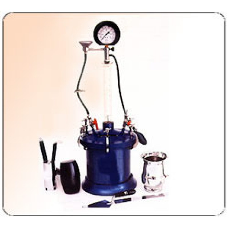 Entainment of a small amount of air in the cement concrete has been found to improve considerably the durability of concrete. The recommended limits specified for the air content are between 3% and 6.5%. Small percentages may result in deterioration taking place more quickly, and larger percentages may reduce the strength without any addition in the durability of concrete.It consists of a pressure-tight flanged cylindrical measuring bowl, fitted with a removable flanged and a conical cover assembly with a seal in between. The conical cover has an air valve and a pet cock for bleeding-off the water. A cylindrical stand pipe, which is graduated in percent air content, is fixed on the conical cover assembly. Each apparatus is supplied complete with a calibrating cylinder, pressure gauge, funnel, trowel and tamping bar