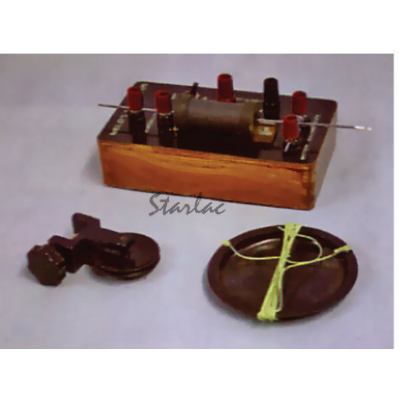 comprising a wooden resonance box of 114cm length, 12.5cm width and 10cm height, with two rules 1 mt. long sub-divided into millimeters. One each brass and steel wire of different dia. attached to fixed bridge and tensioned by line adjustments pegs, two moveable bridges, pulley and fixed screw to enable a third we to be fixed for tensioning by masses. One each additional wire of steel and brass, each 1.5m length and of 22swg.