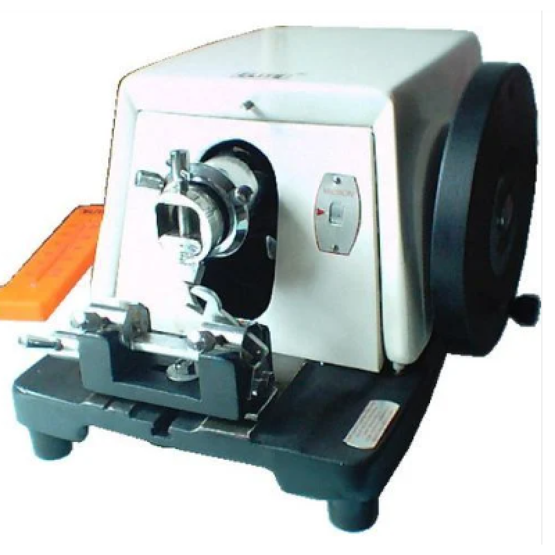 An ideal instrument for use in biological educational field engaged in research work. Heavy cast base to ensure rigidity and stability with protecting aluminium housing. The feed mechanism is independent of the vertical movement of the object block with every complete revolution of the counter balanced drive wheel, the feed pawl engaged precisely into the teeth of the ratchet wheel, feeding on the forward stroke. The. ratchet wheel rotates a feed screw which advance. the cone a measure distance from left to right across the face of a vertical moving inclined plane, Compound side way provide. smooth accurate object traval. 111 the microtome automatic feed release device is provided which disengages the mechanism automatically and feed is adjustable with the help of knurled knob at the back of microtome from', to 50 microns in step of 1 micron The feed indicator graduated in micron is conveniently located on the front which works with the help of cord and pulley system.