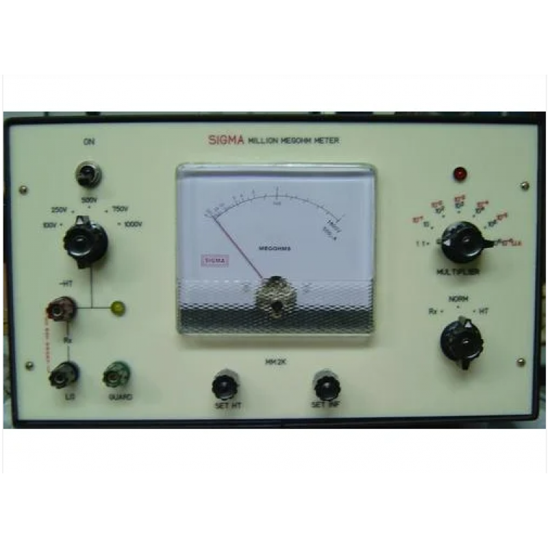 SIGMA Million Megohm Meter is an ideal instrument for measuring high resistance and insulation. Since it applies a highly stable IC regulated H.T up to 1000VDC across the element under test, it serves the purpose of a megger also. It measures the insulation resistance of the sample under stress by subjecting it to the voltage. It has a measuring range of 1 Megohm to 100 Million Megohms in seven decade ranges and is capable of reading up to 100 Million Megohms (10 15 Ohms) with accuracy operational amplifiers ensures low drift, low input bias current,