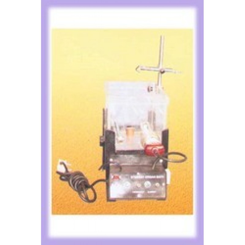 A Perspex bath double sealed for leak proofness size 9" x 6" x 7" Deep, complete in all respects, thermostatically controlled, fitted with a special heater, I.S.I. marked thermostat, pannel with neon light and on/off switch, connecting cord. Supplied complete with clamp holders, glass vessels, short length rubber tubing, oxygen tube. Frontal lever from Stainless steel capillary, to work on 220 volts A/C.