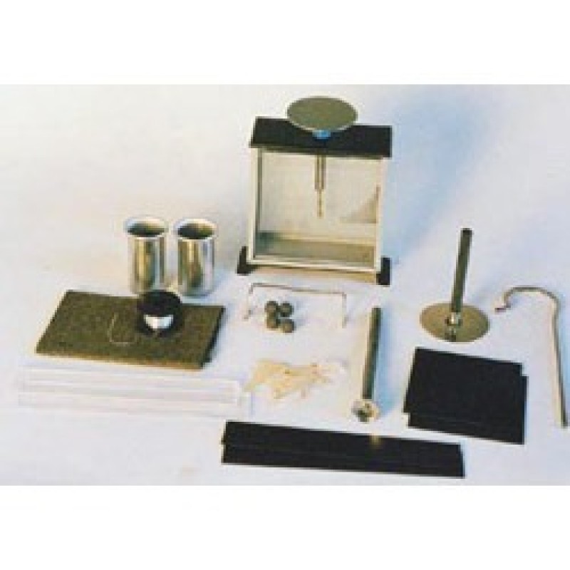 Comprising one electroscope, one packet of metal leaves, 4 metallised spheres, 1 reel of nylon thread,two polythene plates 75 x 75 mm, one electrophorus plate with insulating handle, 1 proof plane. Two aluminium cans, one cellulose acetate strip, 1 polythene strip, one stirrup for suspending strips, one flannel rubber, one wire hook and instructions.