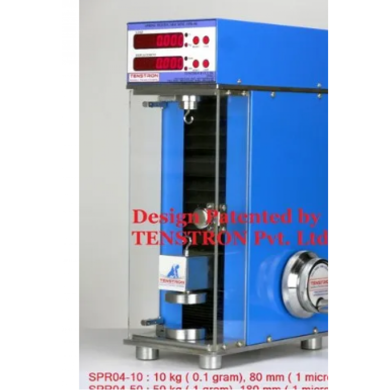 TENSTRON® Spring Compression and Tension Load Testing Machine (TENSTRON-SPR04-50kg) is having ultra high accuracy load and deflection/tension test mechanism with side hand wheel. The design is patented by TENSTRON Pvt. Ltd. (INDIA). This testing machine have accuracy of 1 gram throughout the full scale of 50 kg. with accuracy of 1 micron throughout 180 mm of travel. The machine is capable of giving actual deflection values within the full range of load i.e., from 0 kg to 50 kg. The load and deflection both readouts are in two units i.e., kg. and N, mm and inch respectively. Which can be selected through a push button on the go. The high accuracy ball screw is used with combination of high quality slide rods and slide for smooth displacement with anti back lash mechanism which provide the system a high stability and repeatability along with minimized operating frictions.