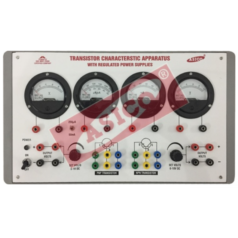 Features :Instrument comprises of Two DC Regulated Power Supplies 0-10VDC/150mA & 0-1VDC/150mA, four round meters for voltage & current measurement, one PNP & one NPN Transistor mounted behind the panel, connections of Supplies & Transistors brought out at 4mm Sockets.
