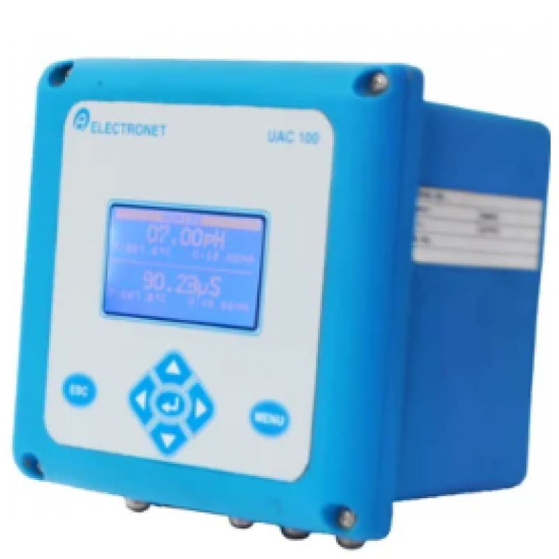 Electronet Series UAC - 100 is dual input analyzer with single or dual sensor input. This analyzer supports a wide range of measurement choices in industrial applications. It can accept pH / Conductivity / ORP / DO sensor input in any combination. The high-contrast LCD with back-lit provides live measurement readouts in large digits and shows up to four additional process variables.