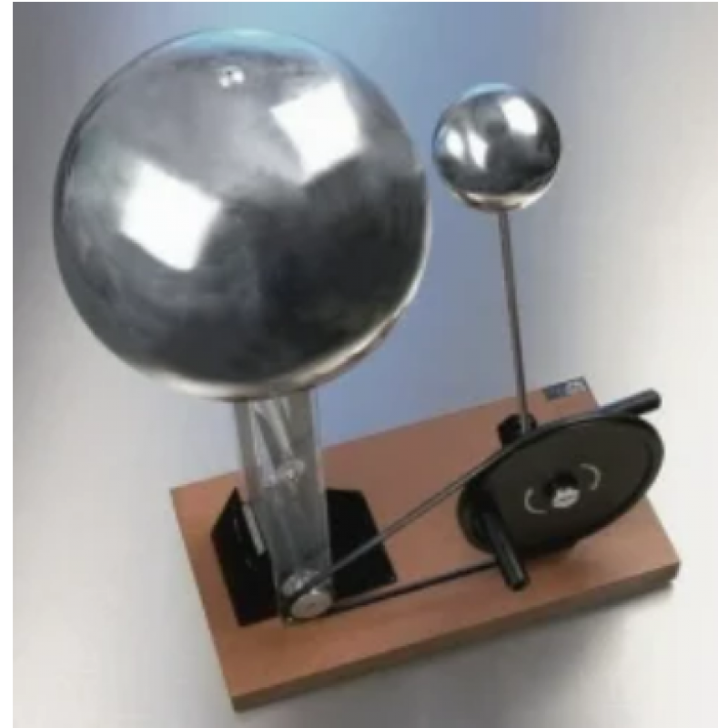 Hand operated on base. A metal sphere surrounds the upper pulley assembly and charge accumulates on the sphere, which is insulated by a plastic column supporting the pulley assembly.