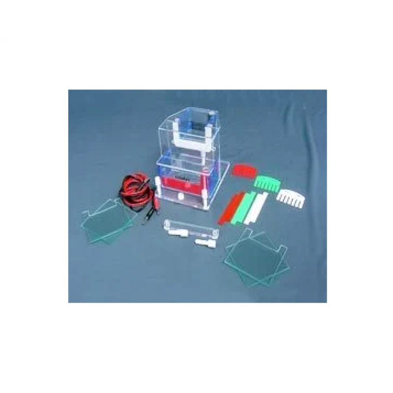 We offer vertical electrophoresis apparatus that is used for sequencing. This system shows the components common to all vertical slab systems. The gel is cast between two glass plates, separated by spacers. The gel is mounted in the system so that the top is in contact with the negative electrode chamber, and the bottom is in contact with the positive electrode chamber. Unlike the horizontal system, the only connection between the buffer chambers is through the gel. This allows precise and reproducible control of the voltage gradient. Because of the high resistance of the thin gel, the apparatus must have provisions for cooling.