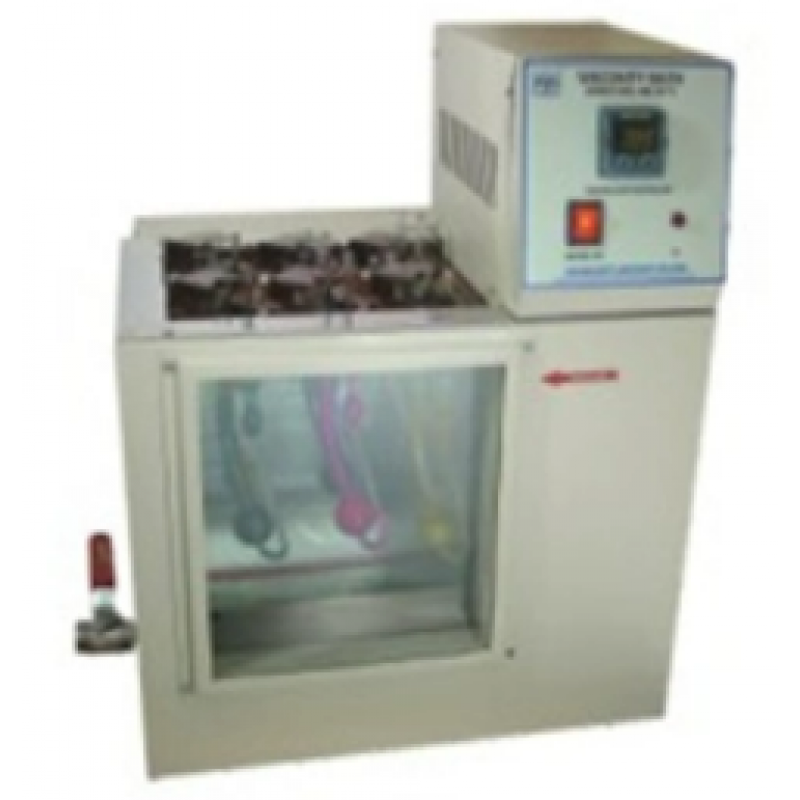 Viscometer bath in 12" Dia x 12" Height of glass tank, 1/12 H.P. AC Motor 1450 RPM for Stirring. 4 nos. bakelite clamp for holding Viscometer U tube ( Supplied without viscometer tubes.) Immersion heater from top, Power consumption 1 to 1.75 K.W., Max Temp.100 oC or up to 250 oC, Resolution 0.1 oC or 1 oC. M.S. powder coated outer box. Florescent tube for illumination, Digital PID oC Temp. Indicator Controller. Apparatus runs on 230 volt AC single phase supply.