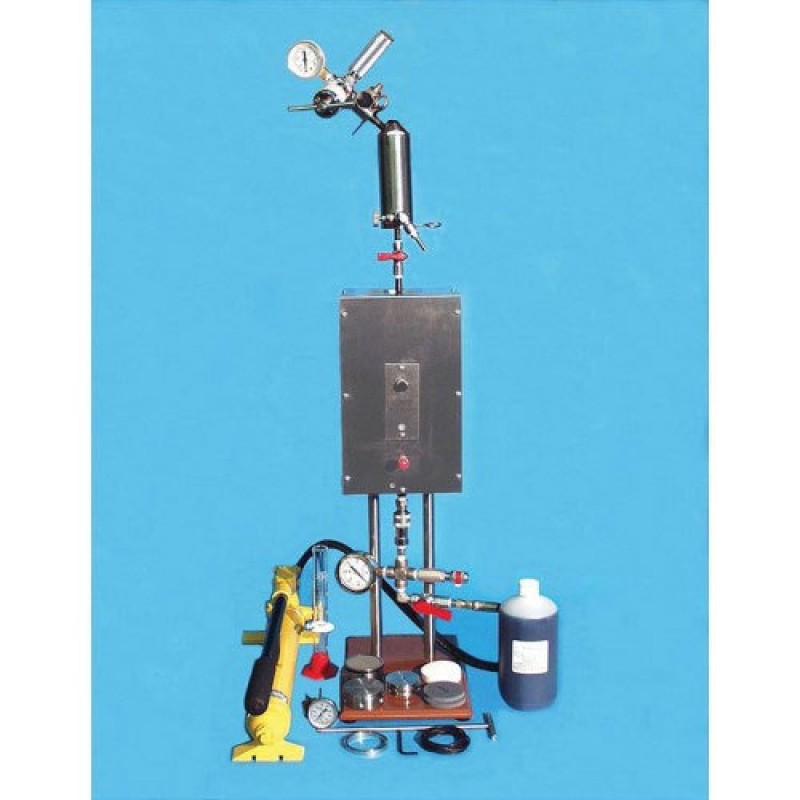 Container ring of 100 mm diameter and 500mm high, held between a bottom plate and a water cell. The water cell of 10mm diameter brass cylinder and the top and bottom plates of brass or any other non-corroding metal. Each cell with collar is clamped in between a base plate and a top plate with the help of tension rods and nuts. The cell assembly is mounted on the stand. The top plate is provided with an inlet and air release vent and the base plate is provided with an outlet. Complete with a pressure chamber fitted with a pressure regulator and pressure gauge 0-7 kg/cm sq. indicating the test pressure with a single gauge without an air compressor and foot pump.