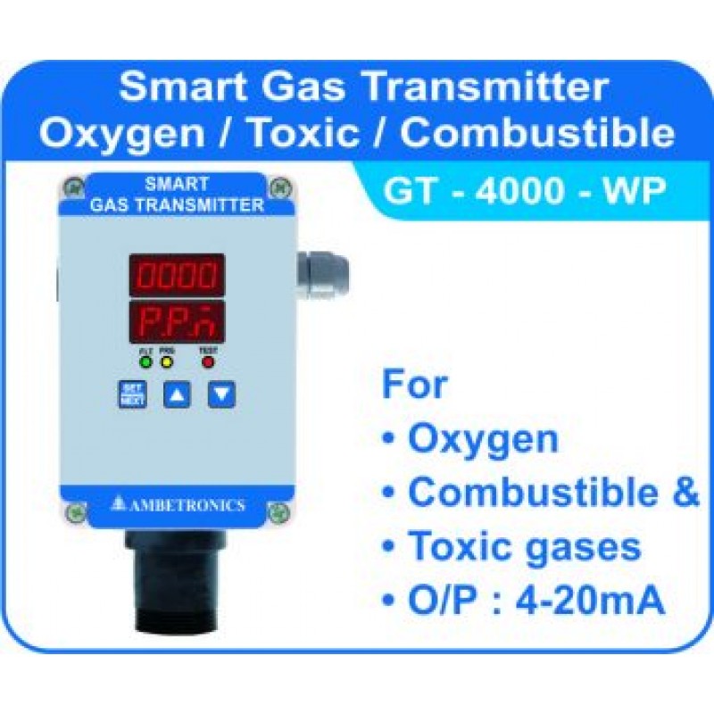 The GT-4000-series Gas Detector is a microcontroller based Smart Gas Transmitter, which has the feature of dual display of gas concentration and unit of the gas and has a plug-in sensor. The detector has programmable linear and password protected programming with password changing facility. The Transmitter is suitable in hazardous area and is ready to use with any DCS, PLC and Ambetronics controllers. The Micro-controller based Smart Gas Transmitter is broadly used as PNG or LPG gas detector in burner/ furnace areas, commercial kitchens, power and industrial plant, bullet yard/ storage yard, chemical processing plant, coal mine and confined area.