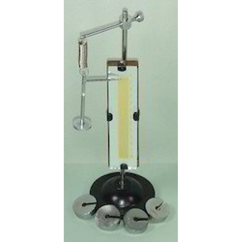 Consisting of 30cm long mirror scale, spring, slotted weights with hanger and pointer, complete on heavy tripod stand.