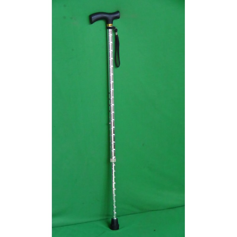 IMI 3062. Light weight, elegant and economical stick have a Long plastic handle for comfortable grip. * Height adjustable from 80cm to 100cm.* Height adjustment is made by slipping spring locking pin in proper notch.* Silencer ring locks the stick securely in place after a height adjustment is made. * Finish; Anodized Aluminium tube finish.* Fitted with non-slip Rubber/PVC shoe for safety.