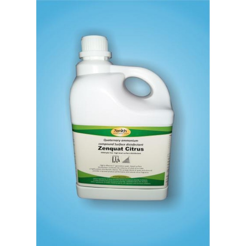 Zenquat Citrus is aldehyde free high level surface disinfectant. Zenquat citrus combines the disinfectant properties of 5th generation quaternary compound with the solvency of citrus oil to make a highly efficacious disinfectant cleaner. The Synergic blend of quats and citrus oil provides an improved product performance and natural citrus fragrance.