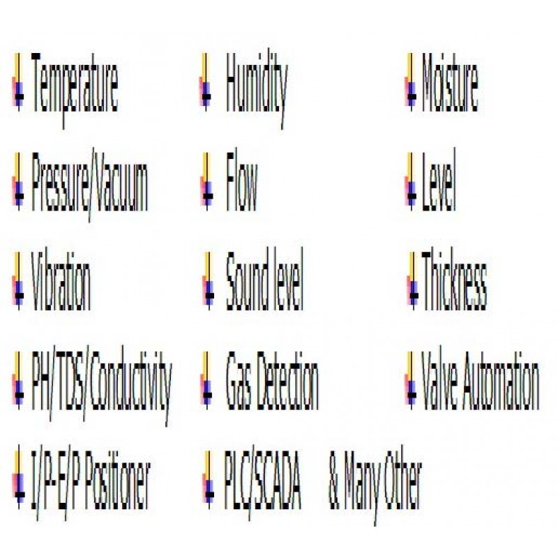 Our Scope of Supply Cover Instrumentations for process industries may include Indicators, Transmitters, Switches, Regulators, and/or controllers for: We are able to measure & Interface the contain like Temperature Humidity Moisture Pressure/Vacuum Flow Level Vibration Sound level Thickness PH/TDS/Conductivity Gas Detection Valve Automation I/P-E/P Positioner PLC/SCADA & Many Other